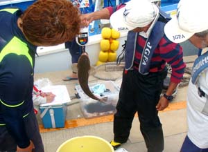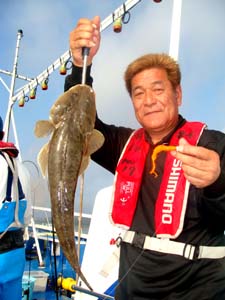 釣り場が遠かったため、午前10時半にストップフィッシング。正味5時間ほどの釣りだったが、数の方は諸喜田さんを含めて2人が最高の8尾。次いで7、6、5尾と続き、21人でトータル72尾。勝手が違うためか残念ながらオデコが3人出てしまったが、平均3.4尾とまずまずの釣果に。一方、審査は1匹の重量で競われその結果、一般参加した千葉市の佐藤信利さん(41=自営業)が1.25kg(57cm)で見事優勝に輝きました。