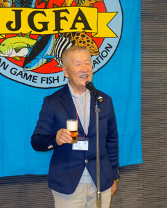 当日は日本各地より95名のアングラーにお集まりいただきました。JGFA前田利幸副会長の開会あいさつに続き、来賓代表としてJGFA賛助会員、マルキユー(株)取締役・中村剛様、そして、(公財)日本釣振興会・副会長であり、JGFA名誉会員の常見英彦様より、おじい様の故常見保彦様のIGFA殿堂入りセレモニーのご報告と合わせ、お言葉を頂戴いたしました。そして、その後JGFA賛助会員のケンマツウラリールジャパンの顧問・松浦賢様より乾杯のご発声をいただきました。