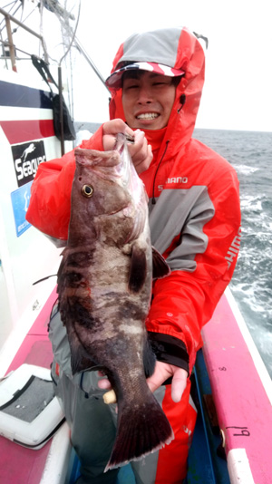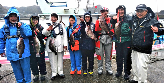 当日は天気予報はよくなく、早朝は曇りでしたが冷たい北東の風が強く、8:00過ぎから結構な雨降りとなり、とても寒くて厳しい釣りとなりました。6:00ごろ出船し、45分ほど走ったところ。水深50m前後の起伏の激しい根の中から探ります。船長からはこまめに水深のアナウンスがあり、頻繁に底を取り直す釣りとなりました。狙うタナはオモリが海底に着いたらただちに3mほど巻き上げて根がかりをかわしながら、底からエサを狙って跳び上がってくるマハタを狙います。エサは生きた大き目のマイワシで、ヒラメ釣りのようにハリを上アゴにかけます。フックは太地のムツバリを使用しました。釣れるときは、底をとるやいなや食いつくことが多々あり、かかったら根に潜られないように一気にリールを巻き、底から魚を引き離します。2度目の潮周り後にあちこちでマハタがかかりはじめ、一気に活気付きました。サイズは1kg前後が中心でしたが、左舷トモから3番目に座った坂本幸博さんが2.6kgを上げ、これが本日の最大サイズになりました。アタリの多かったポイントは朝一番の沖合いでしたが、波が高くなって岸寄りに戻らざるを得なかったため後半はアタリが少なくなりました。マハタのほかには後半にヒラメの1.5kgサイズをあげたメンバーもいました。今回は厳しい天候の中でしたが全員がマハタを手にできたのでよかったです (写真提供:スポニチ&マーメイドAC・林悠二さん)