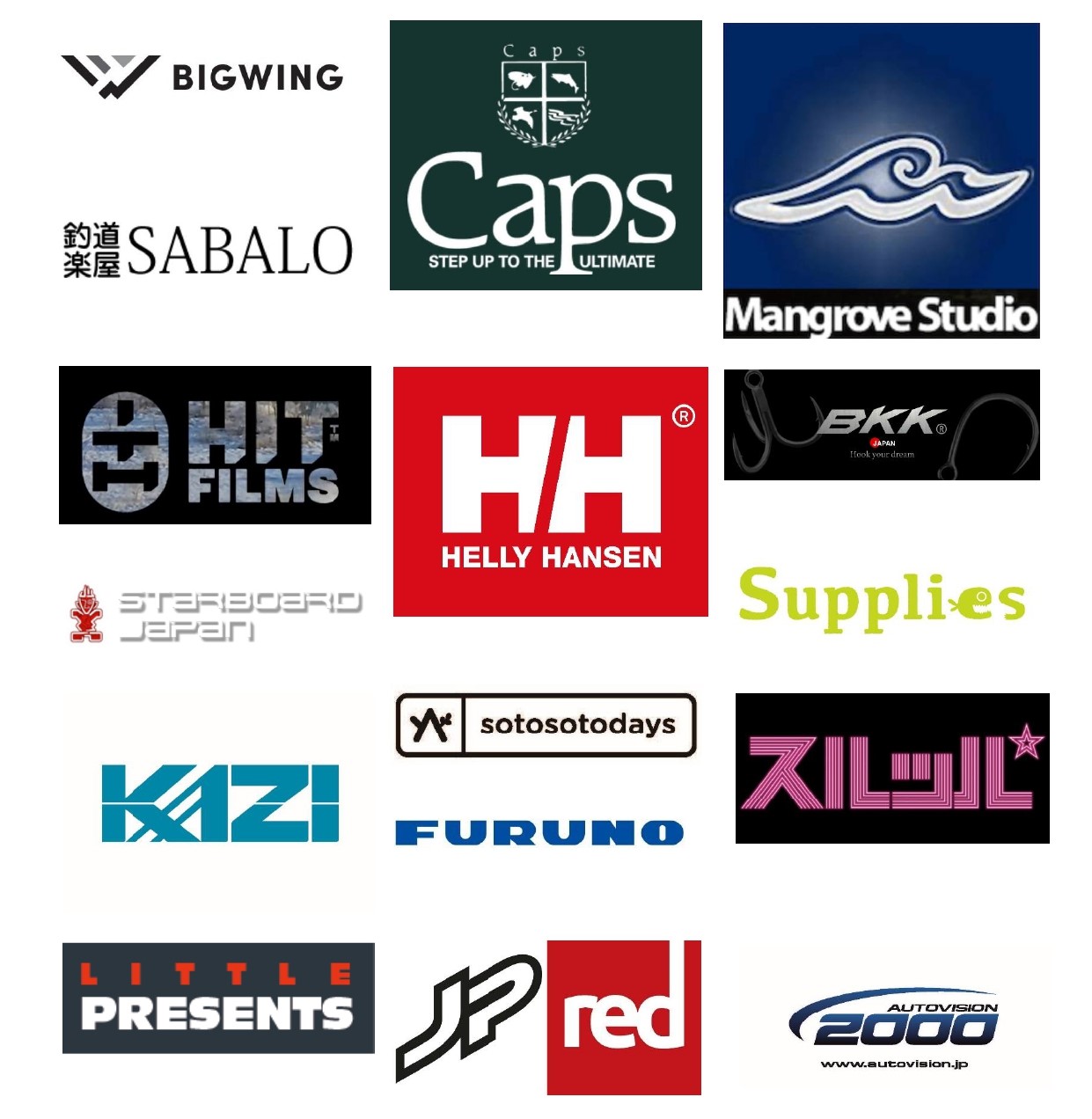 ビッグウイング、キャップス、釣道楽屋SABALO、H.I.T. FILMS、マングローブスタジオ、スターボードジャパン、BKK、HELLY HANSEN、舵社『ボート倶楽部』、Supplies(サプライズ)、sotosotodays(ソトソトデイズ)、古野電気、スルッパ、リトルプレゼンツ、マニューバーライン、オートビジョン2000、AWATAKEルアー