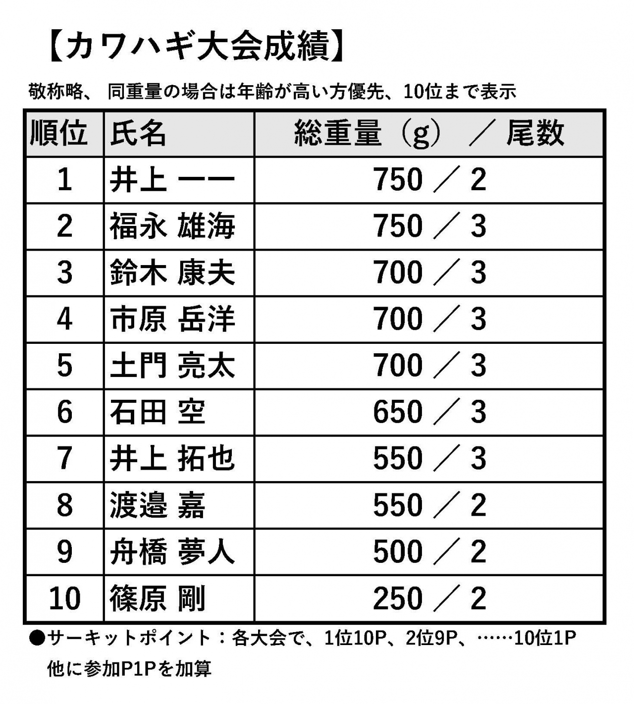 ▼審査 :全長18cm以上のカワハギ3尾までの総重量(それ以下は対象外、同重量の場合は年齢が高い人優位)