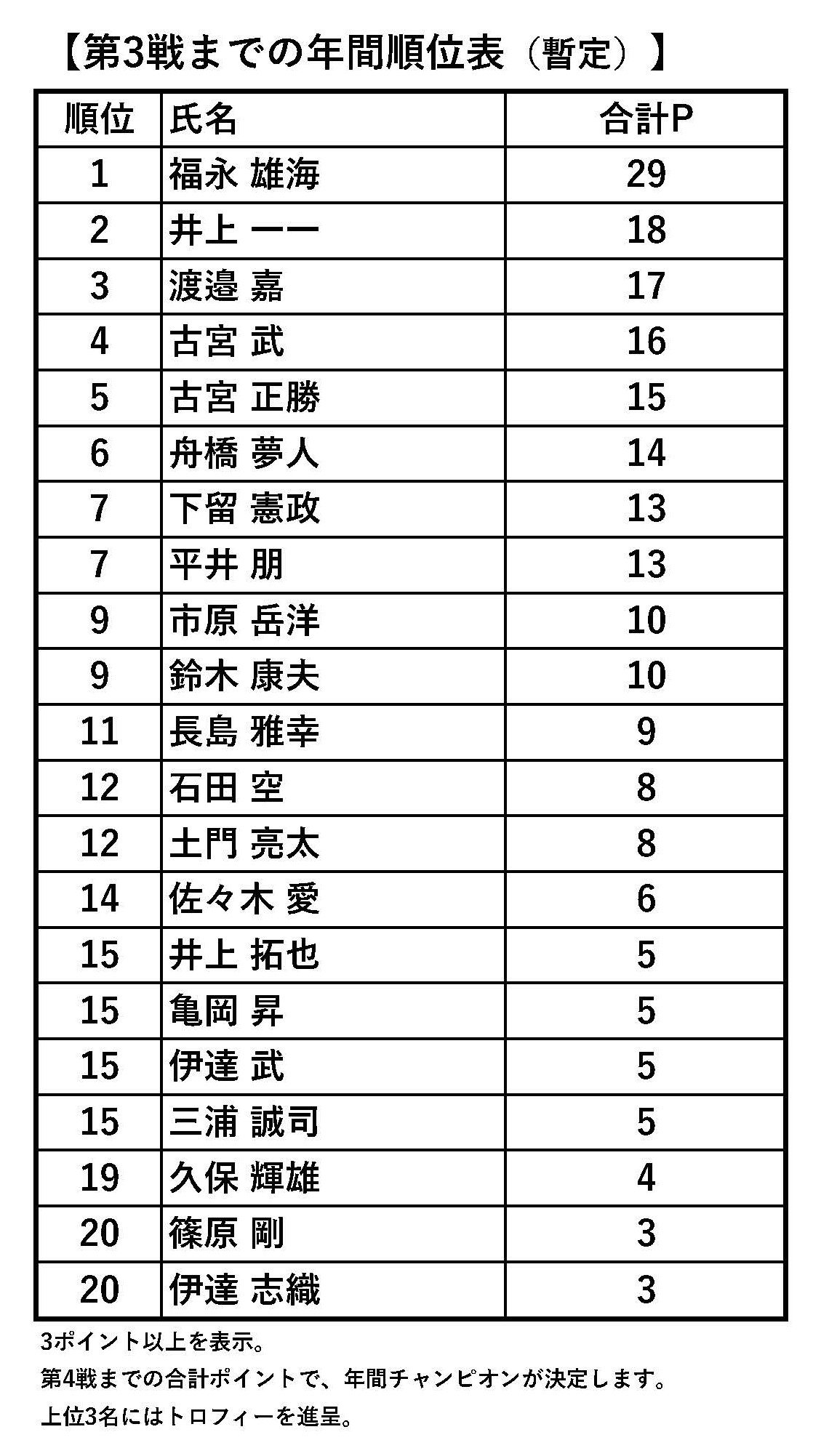 左から3位の鈴木康夫さん、1位の井上一一さん、2位の福永雄海さん