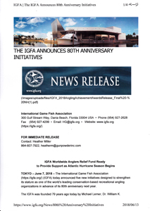 国際ゲームフィッシュ協会(IGFA)80周年を記念する新たな取り組みを発表