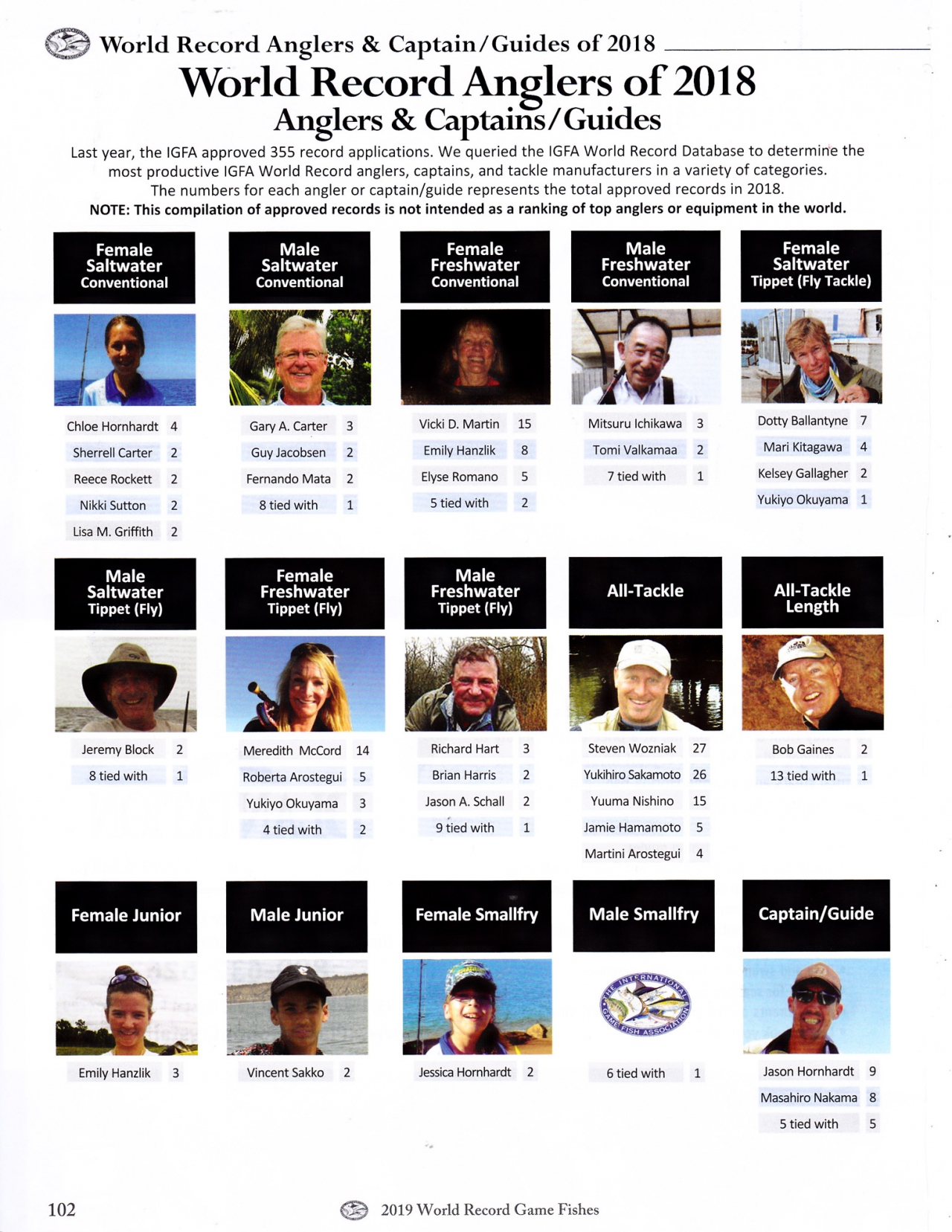 IGFA年鑑2019年版にJGFAメンバーの市川満さんが淡水・男性の部で2018年度世界記録件数で第1位になったことが報じられていました。おめでとうございます!(上段右から2番目)