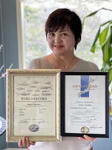 タチウオの世界記録認定証(左)と日本記録認定証(右)を掲げる米澤和代さん。おめでとうございました!やりましたね。