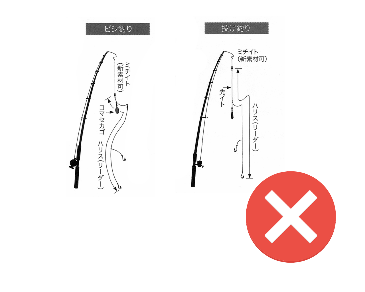 「ボトムフィッシングの場合は、シングルフックを2本まで使用することができる。2本のフックは、別々のハリスまたはドロップで取り付けなければならない。フックを含めたハリスまたはドロップの合計長は、リーダー本線に設けられた接続部間の長さを超えることができない。2本のフックは、別々の餌に埋め込むこと。」