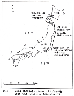 図-1.北海道積丹半島沖でタグ&リリースされたブリが太平洋岸の神奈川県二宮沖(相模湾)で再捕されました。