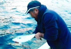 北海道積丹半島沖でブリをタグ&リリースする山口晴由さん(クラブゴールデンドリーム)
