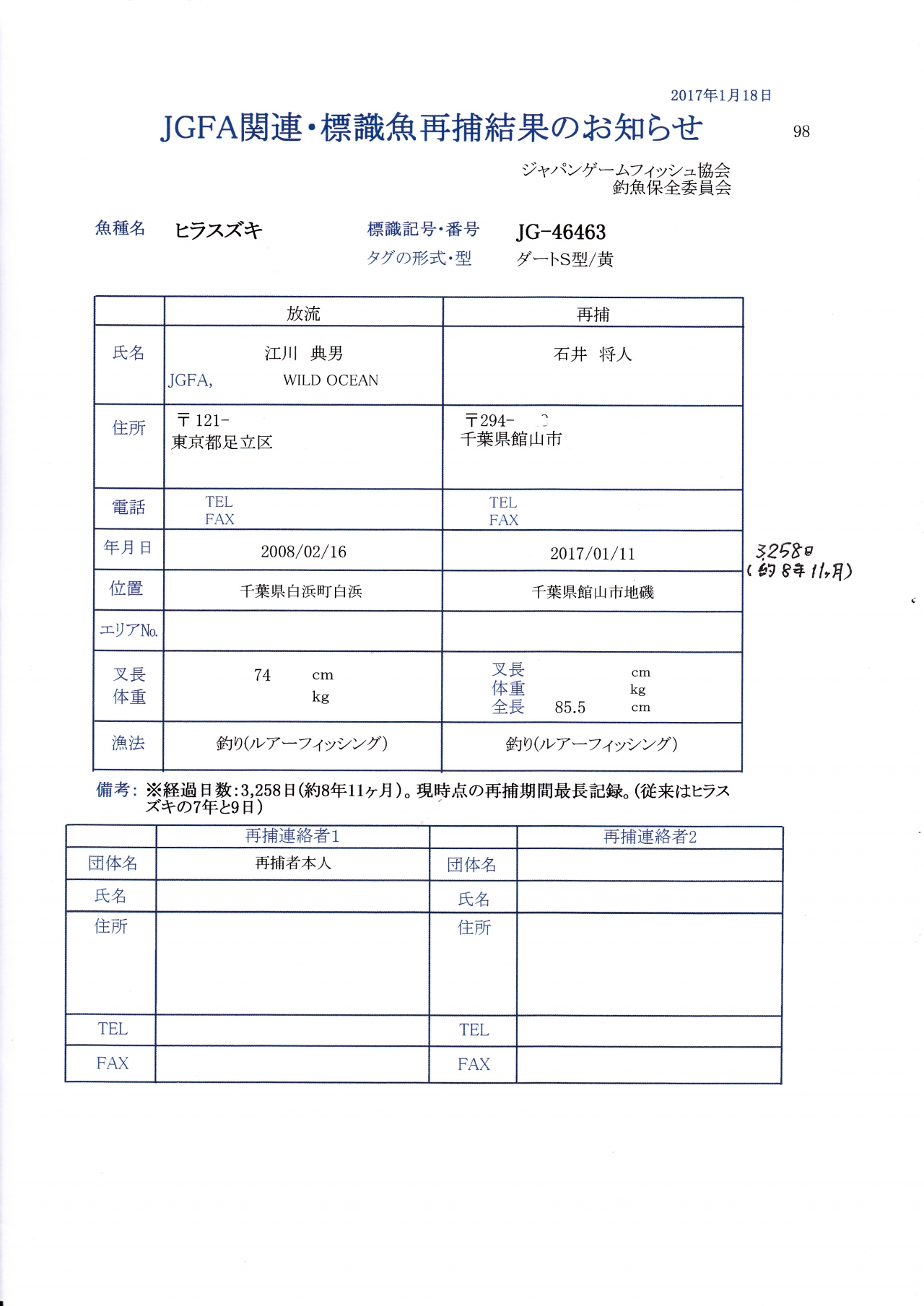 今までのデータからしますと叉長74cmの時点でこのヒラスズキはすでに満7~8才になっていたと思われますので、それに8年11ヶ月が加わり、再捕獲されたときは少なくとも16~17才になっていたのではないでしょうか。