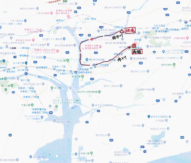 見かけの移動図。放流場所と再捕場所は3.1km離れていました。