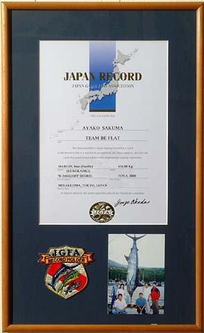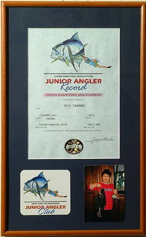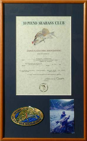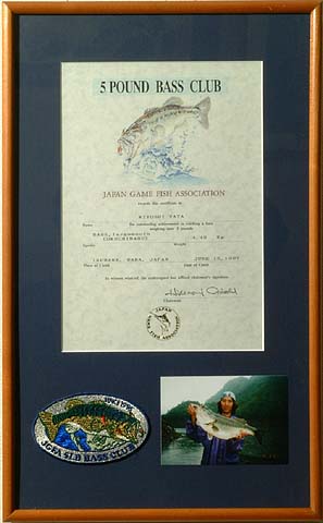 日本記録認定証額です。認定証、レコードワッペン、記録魚の