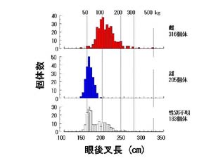 雌雄別体長組成。性別不明の個体は、沖で内臓を除去さ
