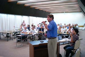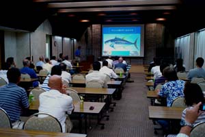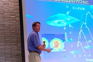 マグロ類のタギングと、それによって得られた貴重なデータの解釈を中心に、講演は進みました。タグを装着した後の再捕率が比較的高いマグロ類(これは、効率的な漁獲が行われているという証拠でもあります)ですから、ポップアップ式の衛星通信タグのみならず、豊かなデータが収集できる高価な体内埋め込み式タグも回収できるのです。