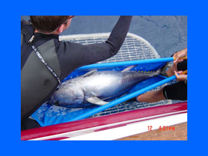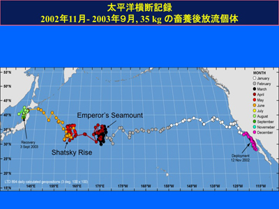 それにより、各種の季節的移動、緯度や経度、また水深による棲み分けのパターンがあきらかになってきました。クロマグロの一部には、カリフォルニア半島から太平洋を横断し、日本海に入ってくる個体すらあるということが証明されています。幸運なアングラーが日本海で釣り上げたクロマグロ、「国産」と銘打たれて市場に並ぶクロマグロも、実はその大回遊の末に日本にやってきた魚なのかも知れません。 |