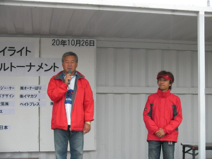パーティーの司会は釣り番組でおなじみの伊丹章さん(右)。 |