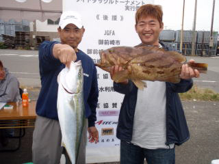 優勝の内藤さんのブリ(左)と、他魚賞のホウキハタ3.74kg