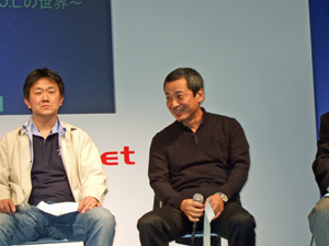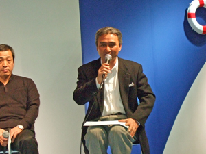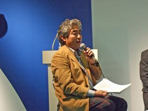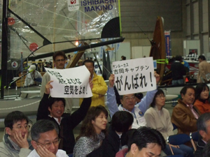 | 会場には吉岡さんのファン?親衛隊?も出現!(ただし、男性ですが・・・・・)吉岡さんにマイクが回ると「話しがカタイよ〜・・・」の声が・・・。 |