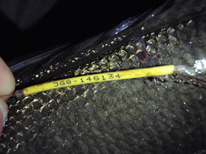 ★タグ打ちの方法ですが、闇雲に打つのではなく、鱗の隙間を通すイメージで魚体の後方から斜め前に打つことによって、タグ本体(印字部分)が魚体にピッタリと添うかたちになり、放流後の水流抵抗も軽減されると思われます。≪写真三枚目≫