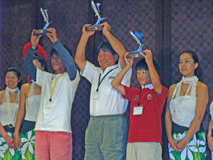 | 個人総合に入賞した3名。左から3位寺園さん、優勝の今津さん、そして3位に輝いた大野祐馬君。 |