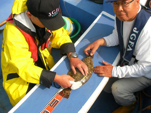 昨年(2009年)の9月27日に千葉県飯岡沖でタグ&リリースしたヒラメが、ほぼ1年後の今年9月29日に茨城県波崎沖(40m)で再捕されました。大会に参加した有坂英さん(会員外)が釣った全長29cmのヒラメを、有坂さん了承の下、岡田順三会長持参のタグを打ってリリースしたものでした。「JGFA主催・服部名人杯・ヒラメオープン大会」で釣られたヒラメは63人参加で227尾に達し、そのうち、タグ&リリースされたのはジャスト50尾。タグを打たずにそのままリリースされたのも150尾前後ありました。つまり、50尾タグ&リリースされたヒラメのうちの1尾でした。この再捕によって、29cmの「ソゲ」クラスのヒラメが1年間で48cmに成長し、立派な成魚になったことが分かりました。ちょっと待てば、ヒラメは大きくなって戻ってきてくれます。