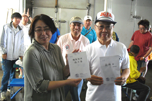 | Âçʪ¤ò»Åα¤á¤ÆÍ¥¾¡¤ò¾þ¤Ã¤¿ÀõÌîÏÂÌ餵¤ó(±¦)¤Ë¡¢²¬ÅĽ绰̾ÍÀ²ñŤ«¤é¾ÞÉʤ¬Â£¤é¤ì¤¿ |