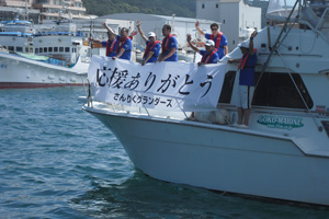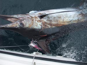 | 第33回大会の優勝魚・クロカジキにタグを打って・・・・ |