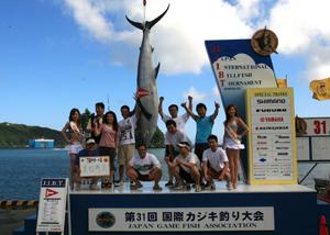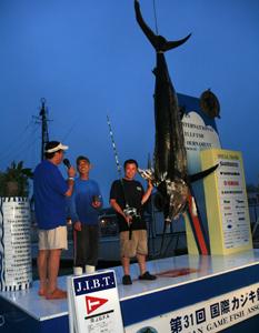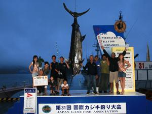 ★成績:初日は、すべてがクロカジキ。フェニックス、ミスリバティーといったベテランチームが確実にストライクをものにする一方、地元・遊漁船「若宮丸」に乗船したマーリン&ツナクラブが30lbラインで225.5kgのクロカジキを上げ、今大会の最大魚をランディングしました。このクロカジキは、9/1に開催される審査委員会で日本記録かどうか審査されます。