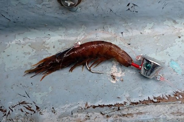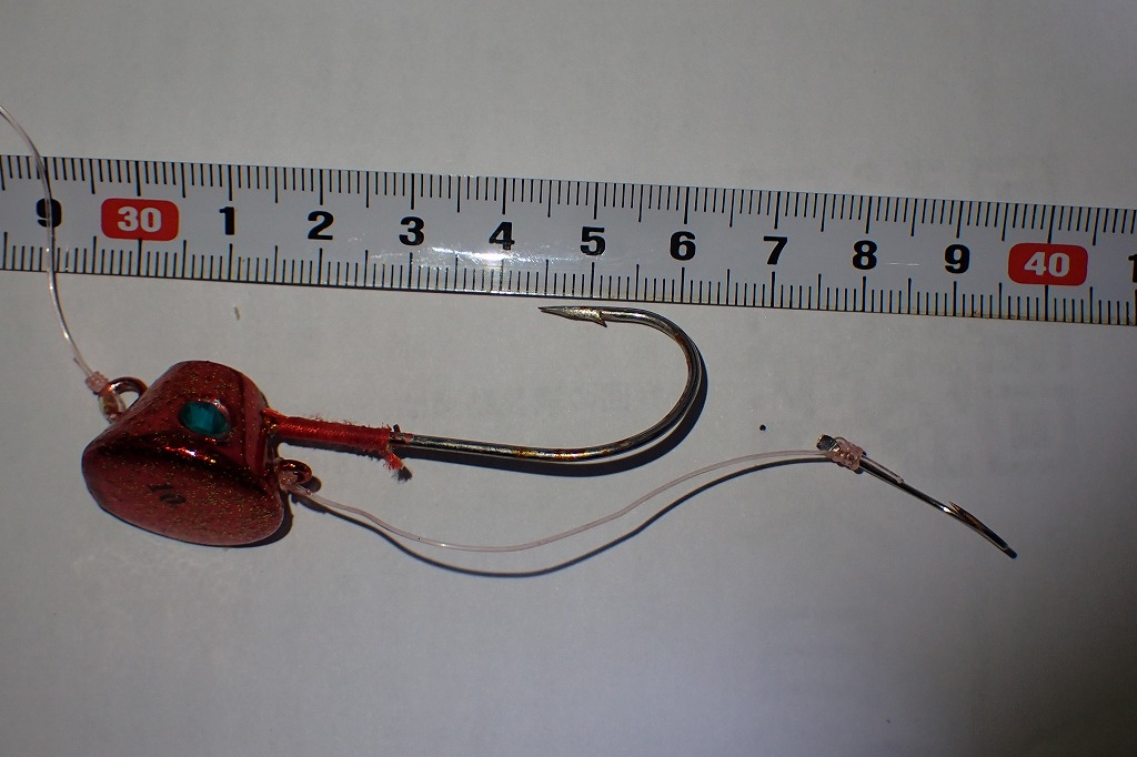 写真のように、エサにシングルの孫バリが埋め込まれていて、アイ間の長さがきちんと取られていれば、OK な仕掛けです。