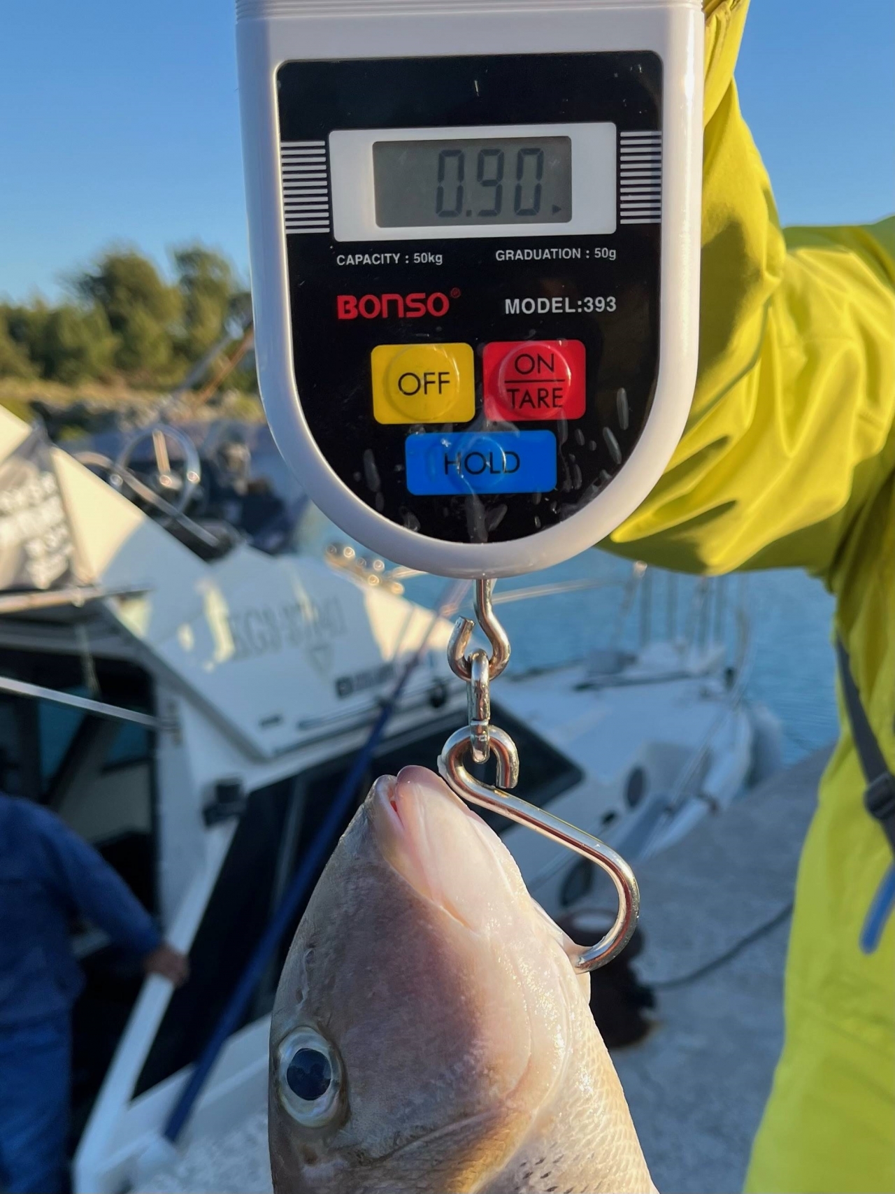 3. 計量中の魚全体の写真(風袋込みの総重量が表示で確認できること)